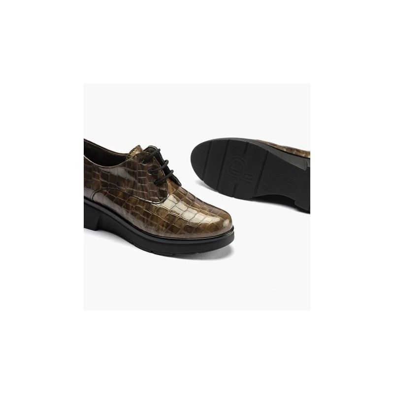 Descripción: Blucher en charol piel coco con cuña corrida y cierre de cordones