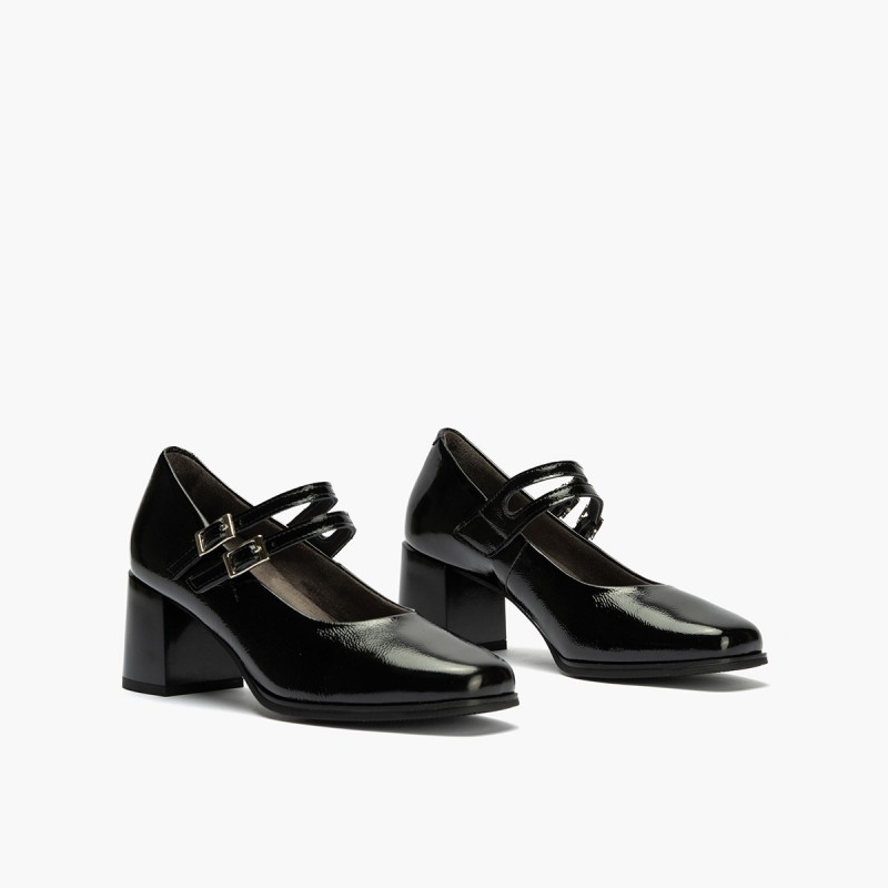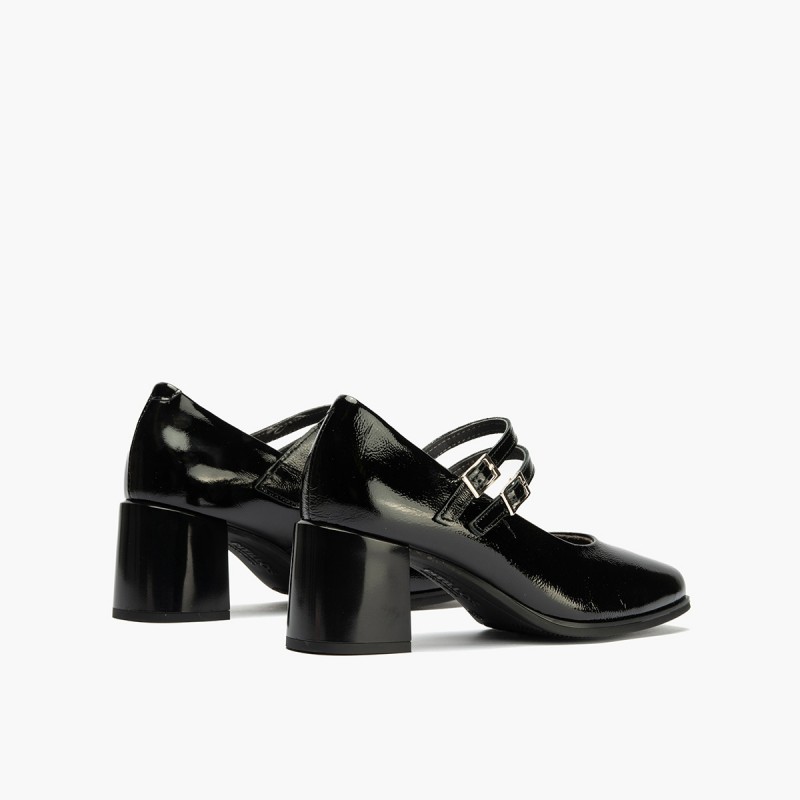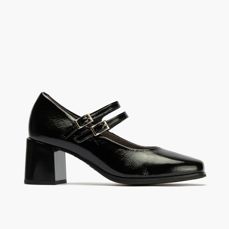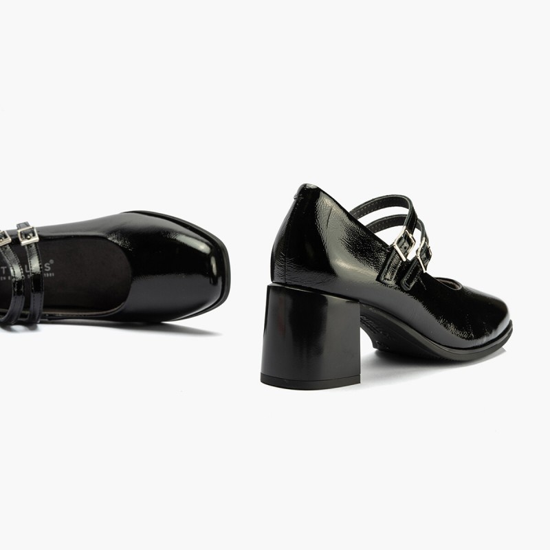Descripción: Zapato tipo merceditas en charol piel negro.