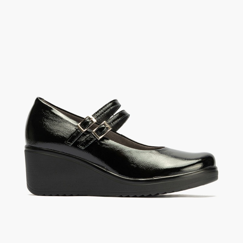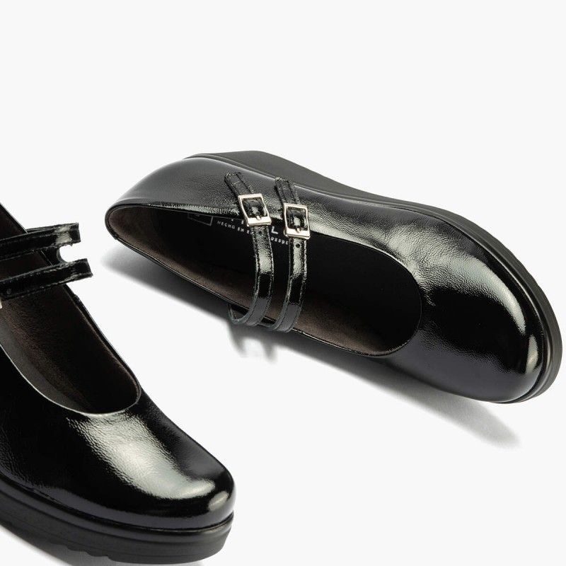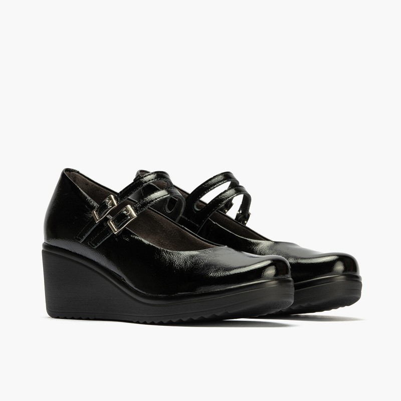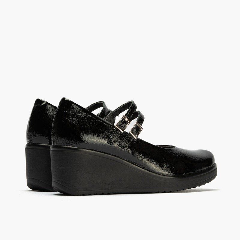Descripción: Meceditas en piel charol para mujer, con ajuste hebilla para un mayor ajuste. Cuña alta con plataforma corrida para que le de mas estabilidad y comodidad al caminar.