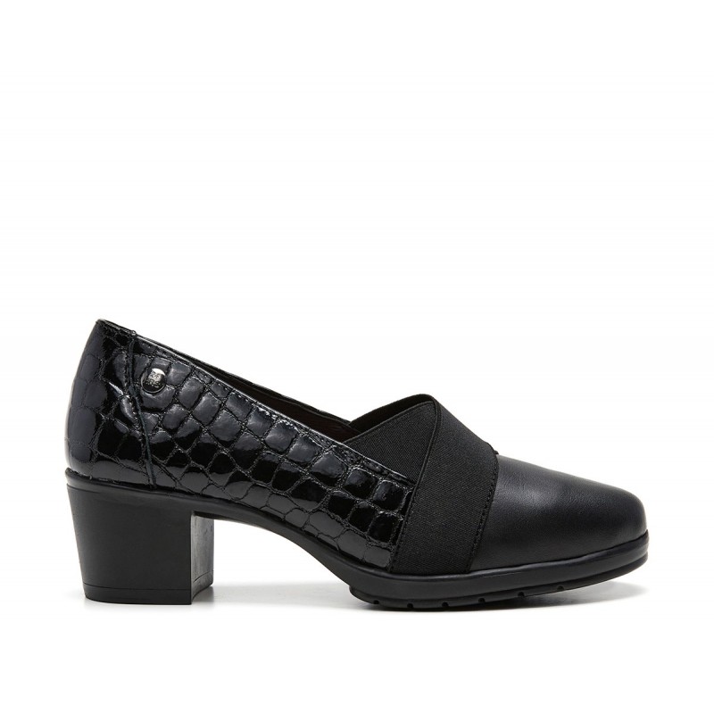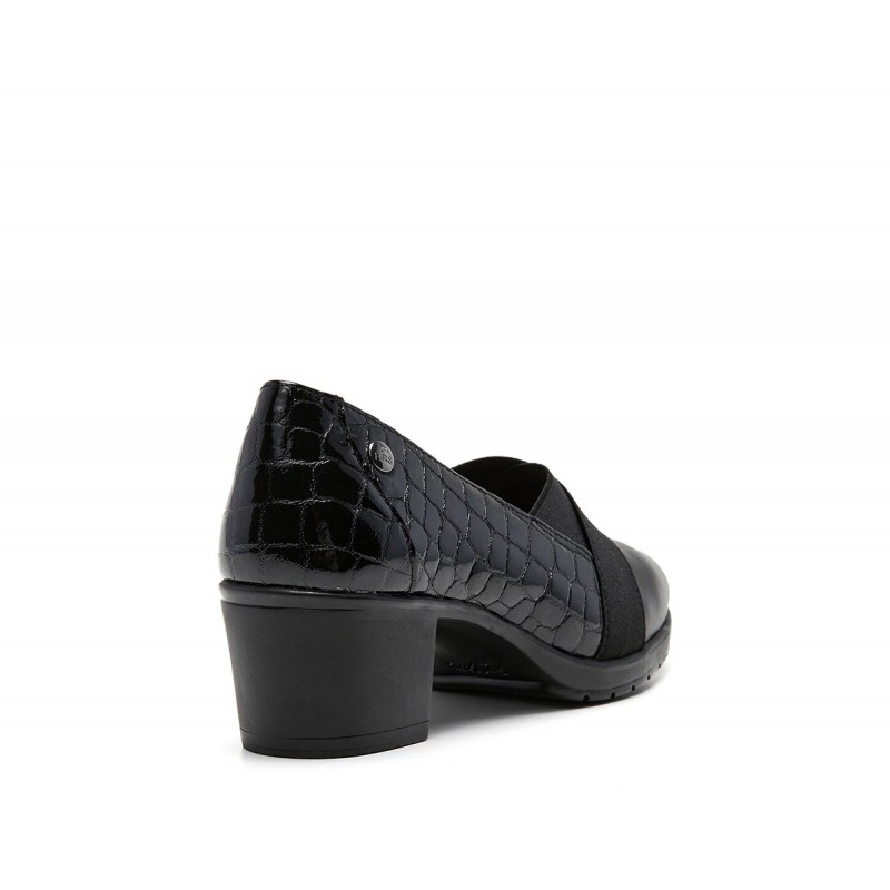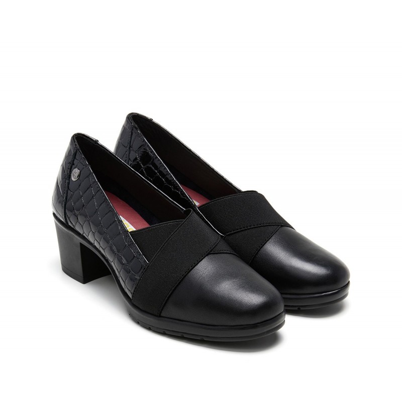 Descripción: Zapato mujer estilo salón diseñado combinado en piel con acabado charol coco alta selección color marrón. Elásticos para facilitar el calzado, detalle de marca metálico y suela de goma con tacón de 5 cm. Un clásico absoluto que encaja a la perfección con tu estilo.