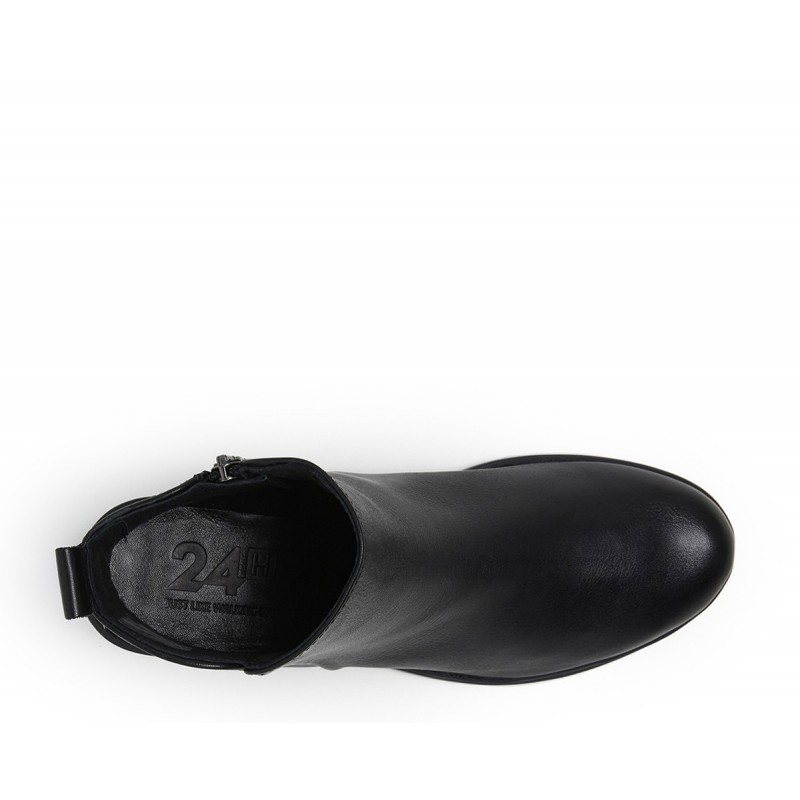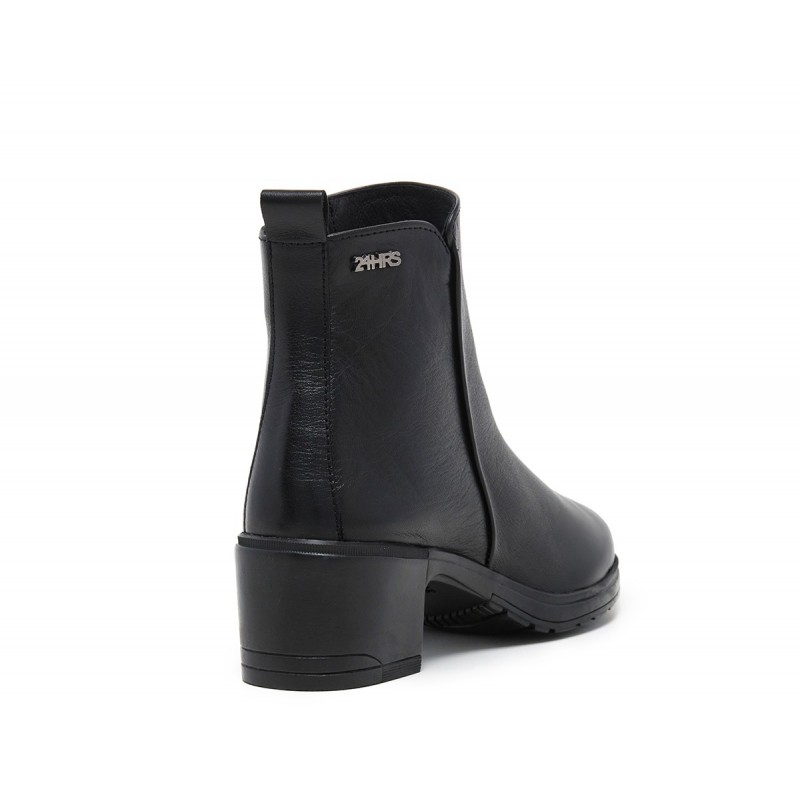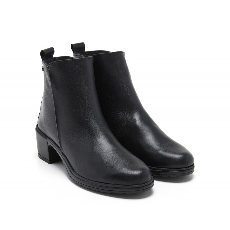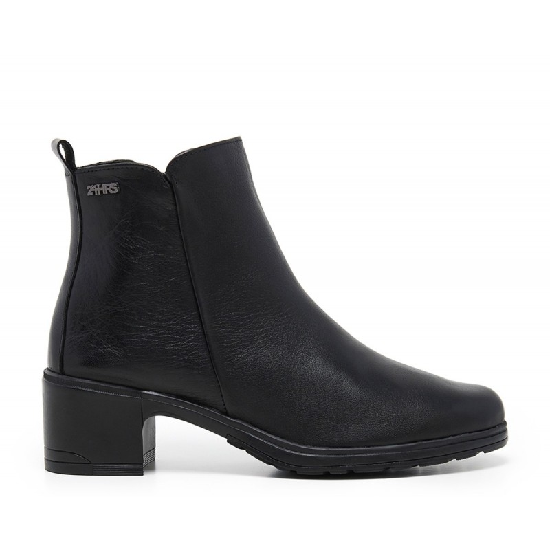 Descripción: Botín mujer confeccionado en piel alta selección color negro con cierre de cremallera lateral y tirador trasero. Puntera redonda, detalle de marca metálico en lateral y suela de goma con tacón de 5 cm. Combinable y altamente cómodo, lo querrás en tu armario desde ya.