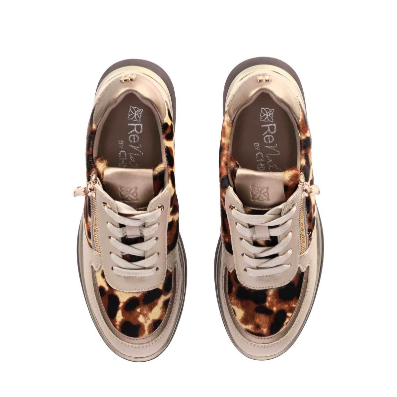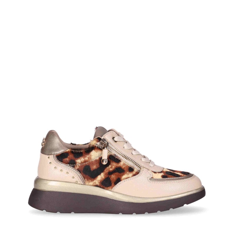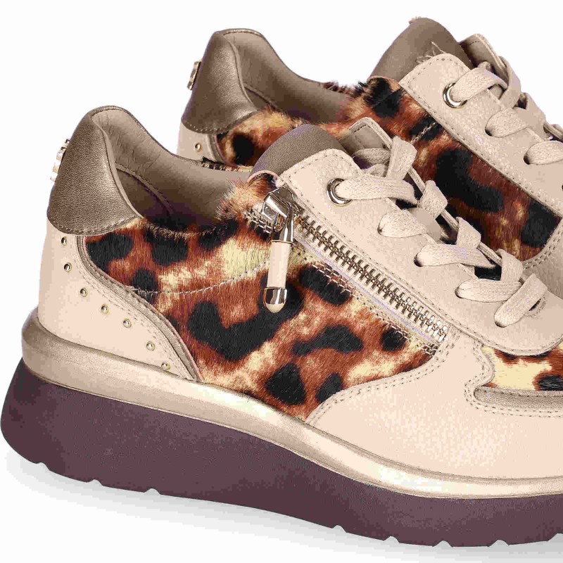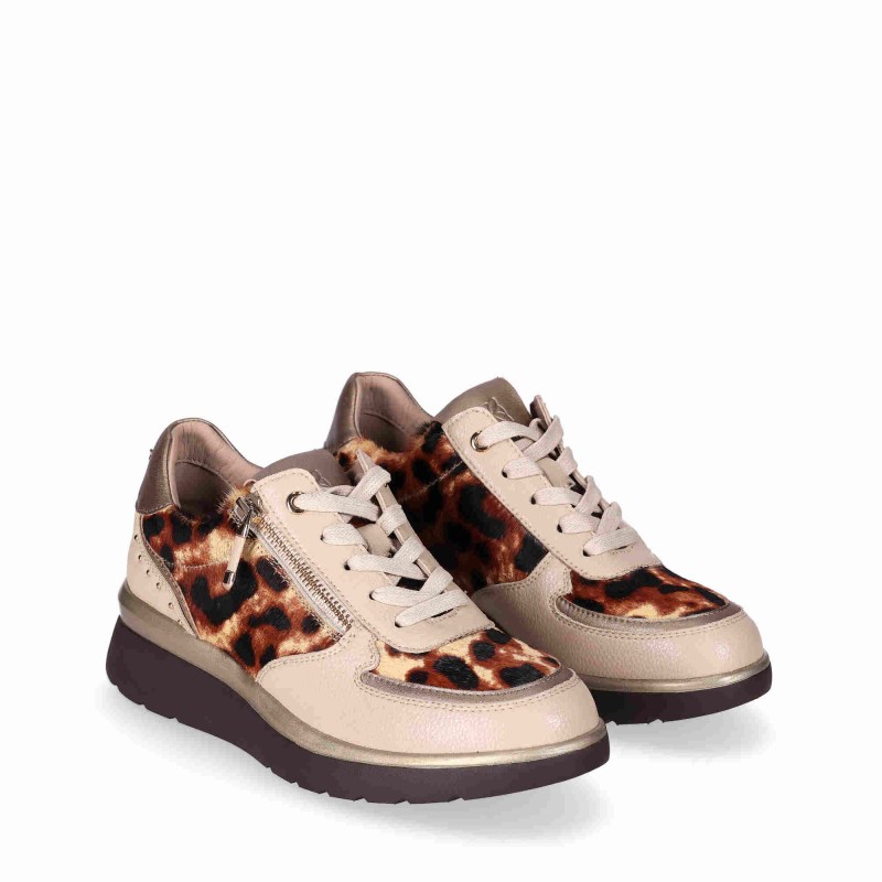 Descripción: Deportivo con cuña baja. Con una combinación vanguardista en cuero y animalprint, destaca con un diseño en cuña baja y un cierre acordonado. Siguiendo la tendencia más chic, las tachuelas metalizadas aportan el toque IN que necesitaba. ¡Perfecto para elevar cualquier look al top 10!