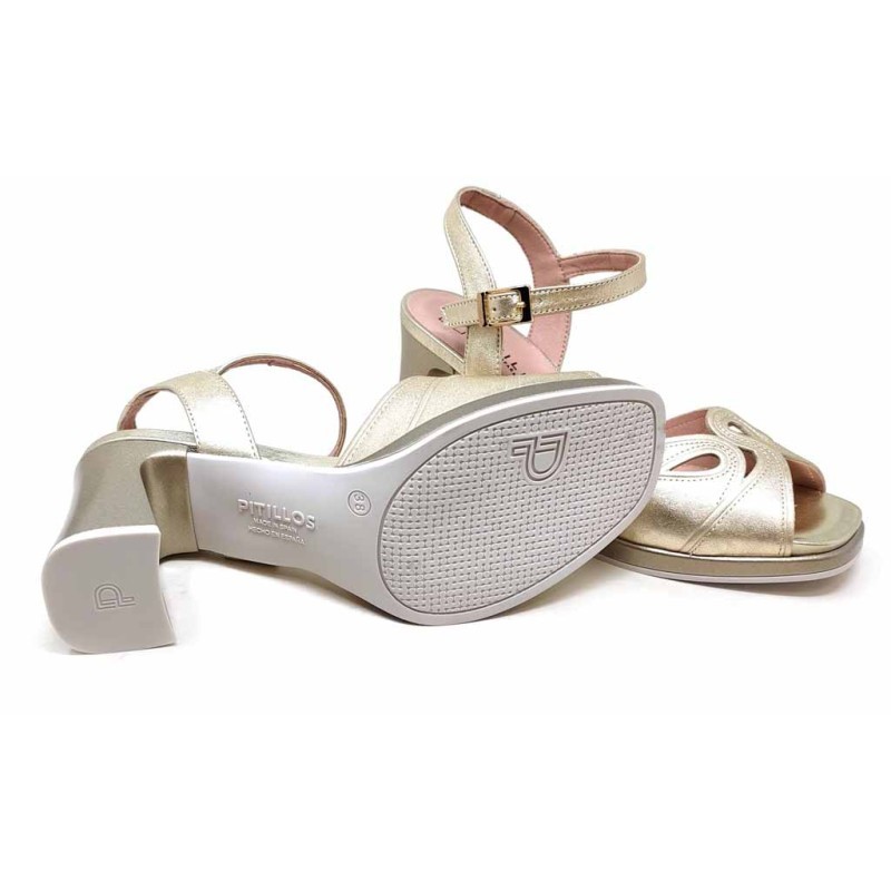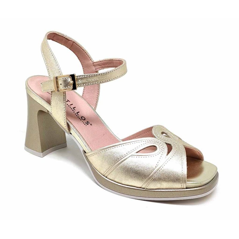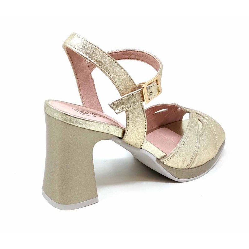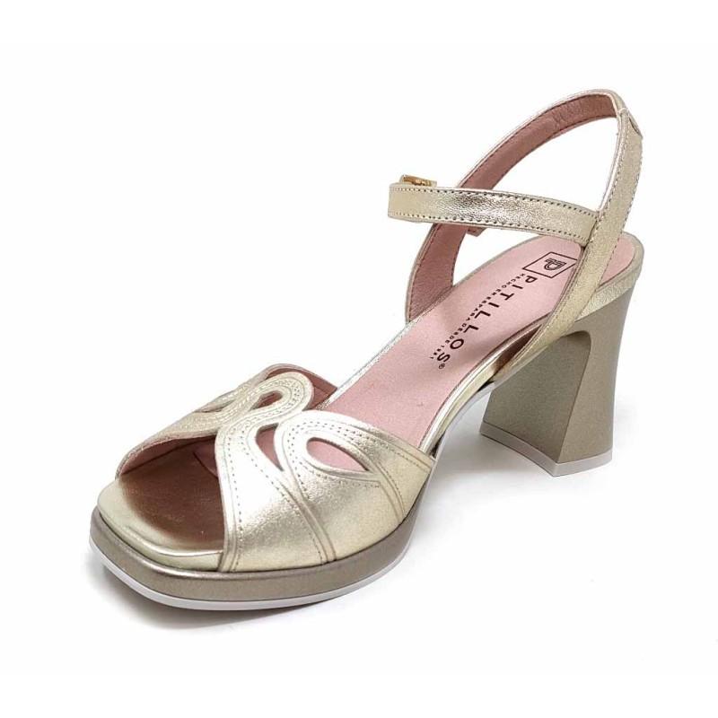 Descripcilon: Sandalia de tacón alto con elegante pala combinada en acabado liso y metalizado. Incorpora detalle troquelado decorativo en la parte frontal y pulsera al tobillo con hebilla ajustable que aporta mayor sujeción y estabilidad. Su tacón ancho de 8,5 cm estiliza la figura sin renunciar a la comodidad.