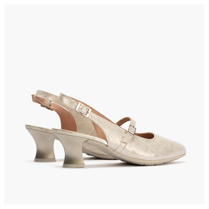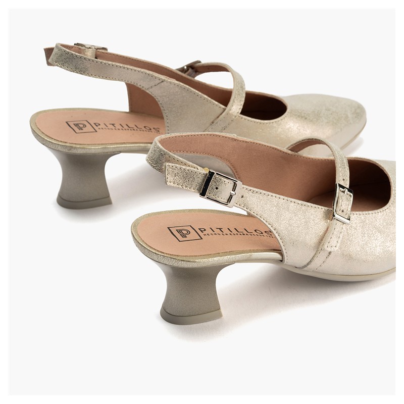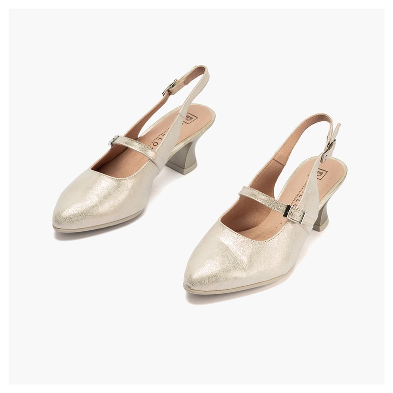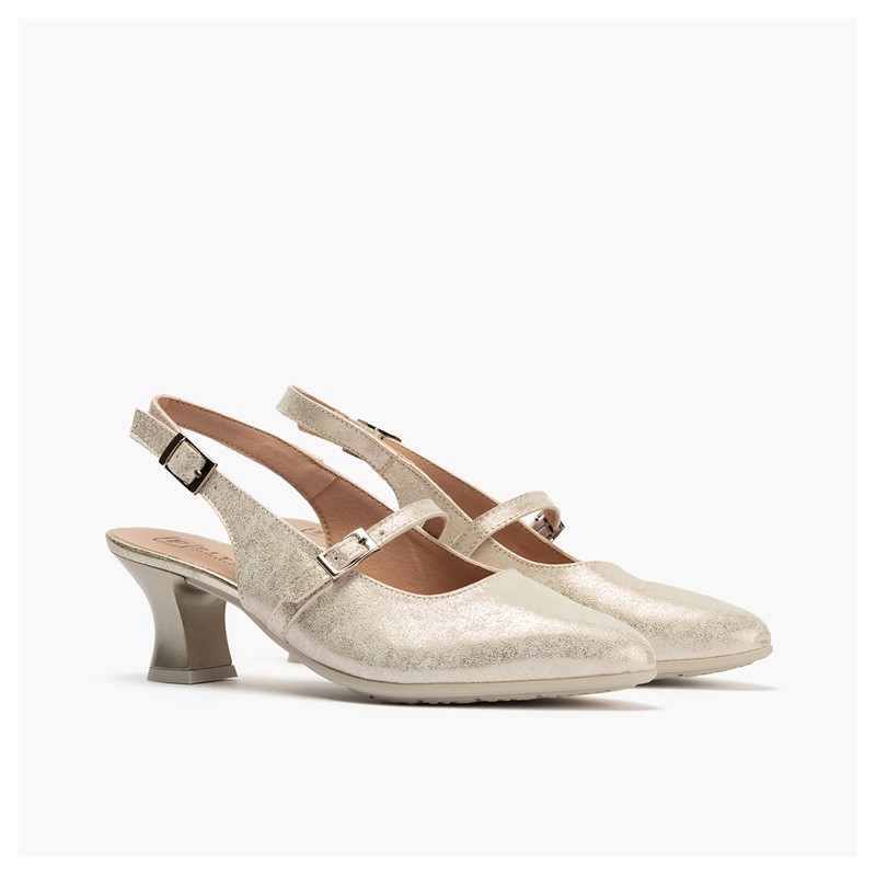 Descripción: Merceditas de tacón de chupete en color oro.