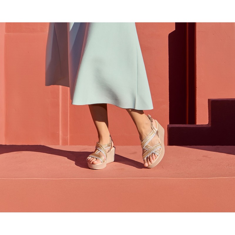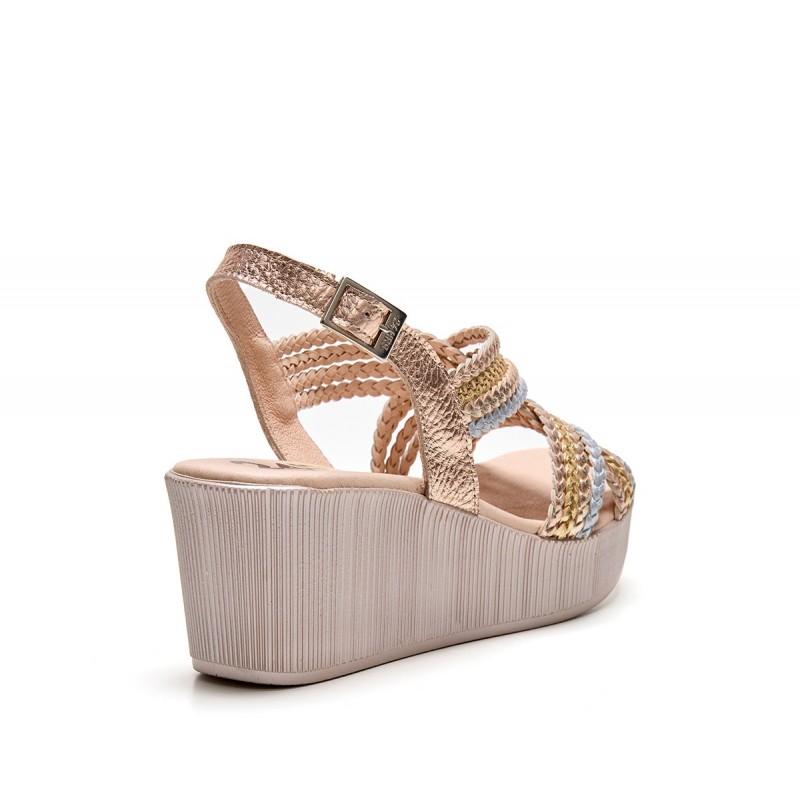 Descripción: Sandalia mujer confeccionada en piel combi metalizada alta selección con cierre de hebilla lateral. Suela PU en relieve con 6,5 cm de cuña y tecnología exclusiva. Ligera, versátil y hecha para armarios como el tuyo.