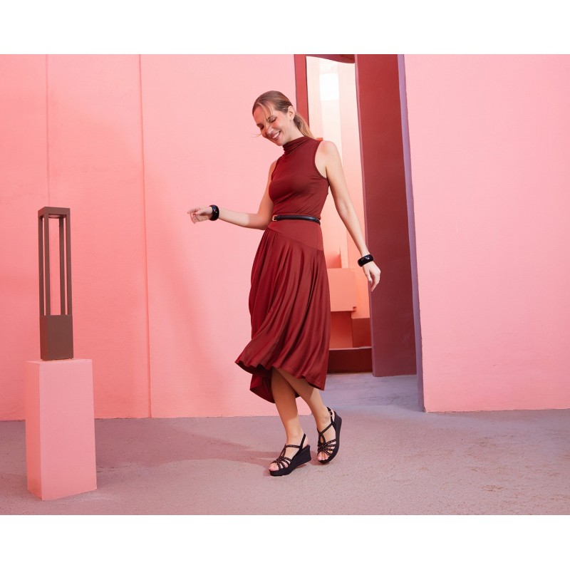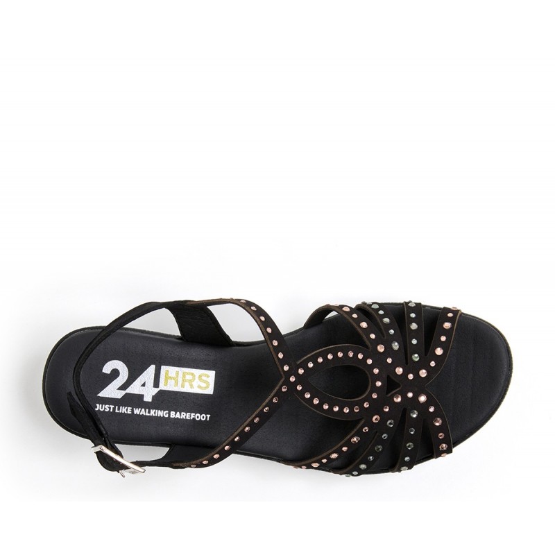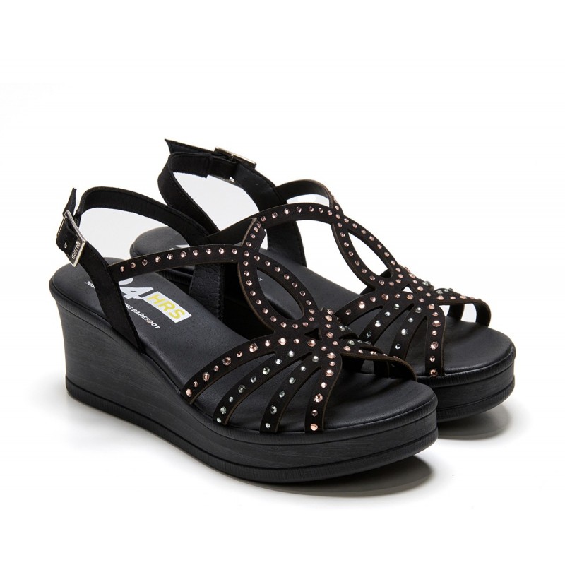 Descripción: Sandalia mujer diseñada en piel nobuck color negro con cierre de hebilla lateral y detalles en pedrería. Suela PU alta calidad, cuña de 7 cm y tecnología exclusiva de alto confort. El modelo perfecto para crear looks relajados con un punto más.