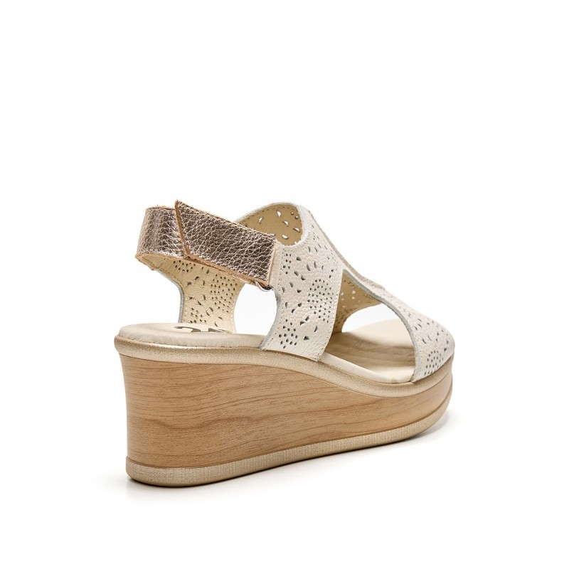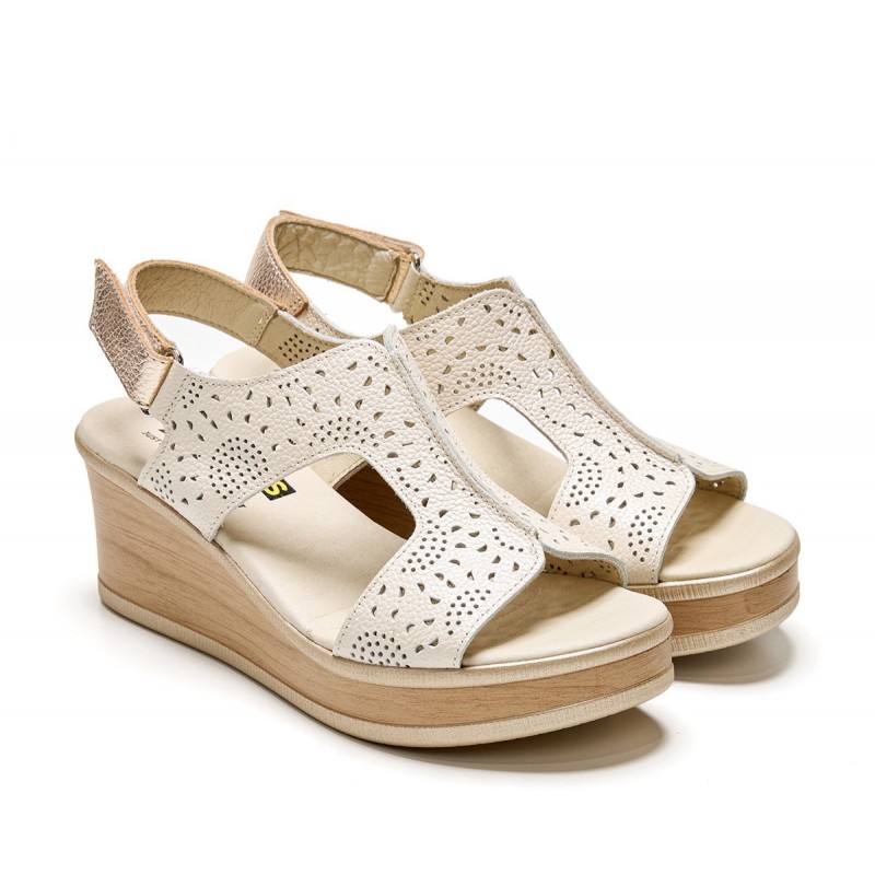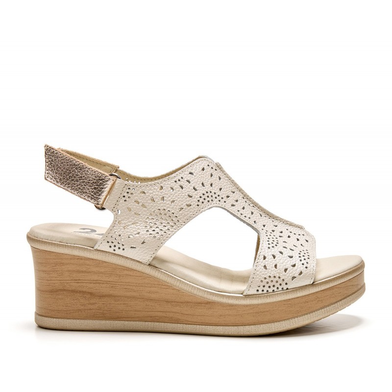 Descripción: Sandalia mujer confeccionada en piel color lino con acabado metálico alta selección. Detalles calados, cierre ajustable de velcro y suela a contraste PU con cuña de 7 cm. Tiene estilo, esencia mediterránea y es sinónimo de comodidad.