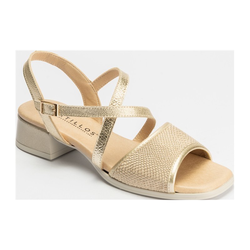 Descripción: Sandalia de piel para mujer tacón bajo en color oro.