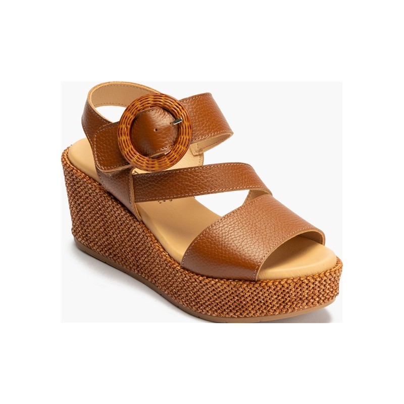 Descripción: Sandalias de cuña de mujer fabricadas en piel color marrón con adorno hebilla, fabricadas en España.