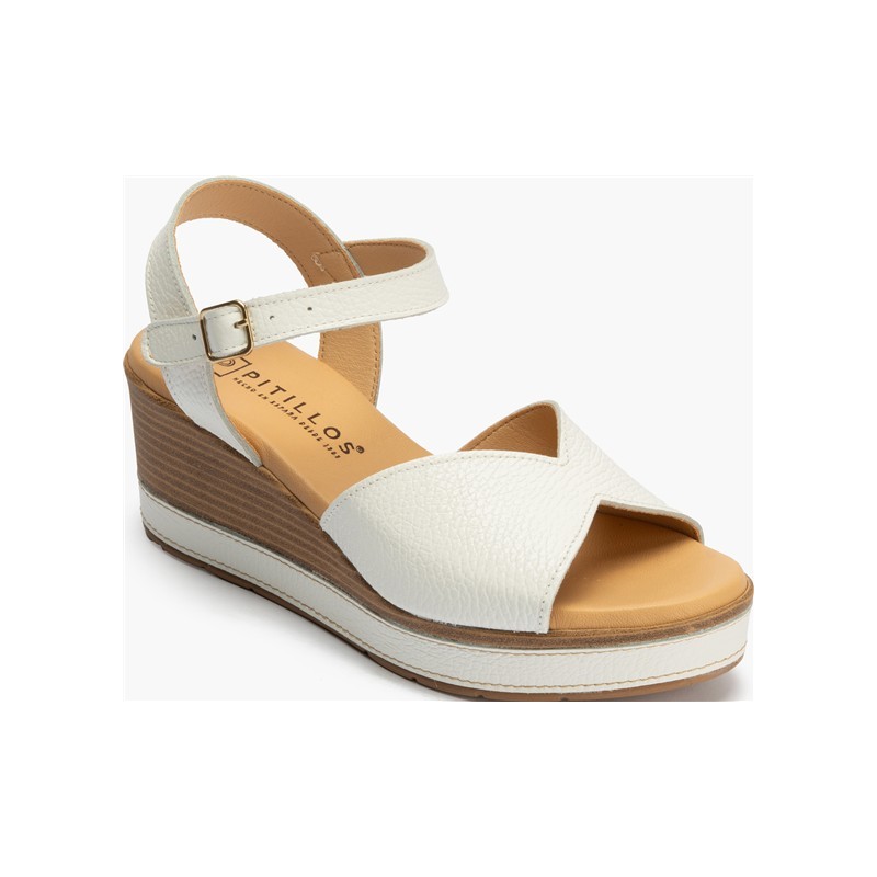 Descripción: Sandalia de cuña de mujer fabricadas en piel color blanco con pulsera y hebilla.