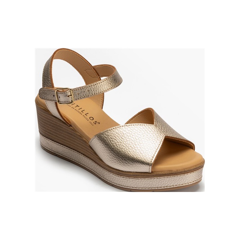 Descripción: Sandalia de cuña de mujer fabricadas en piel color oro con pulsera y hebilla.
